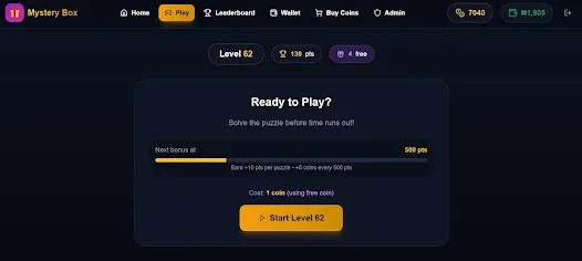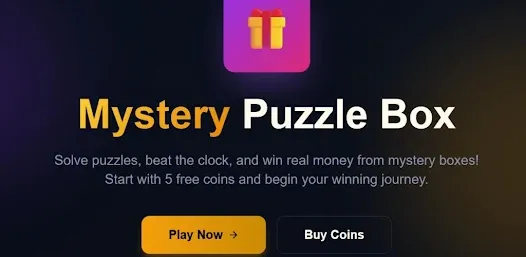Mystery Puzzle Box is an interactive online game where players solve puzzles against the clock to unlock rewards. It combines the thrill of mystery boxes with the challenge of timed puzzles, offering both entertainment and the chance to win real rewards. Key Features * Free Starter Coins: New players receive 5 free coins to begin playing immediately. * Mystery Boxes: Each box can contain real money or additional free coins. * Beat the Clock: Solve puzzles before time runs out to claim rewar